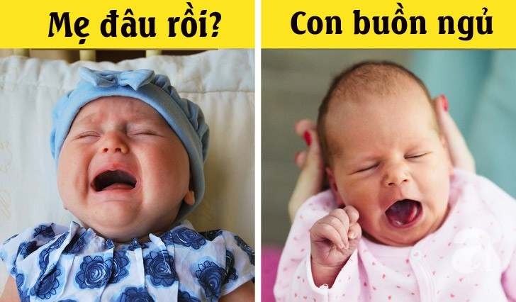 Khóc vì buồn ngủ: Khi em bé muốn ngủ nhưng không thể ngủ được vì một lý do nào đó, tiếng khóc của chúng sẽ nghe như tiếng rên rỉ, sau đó là tiếng ngáp. Em bé cũng sẽ dụi mắt và tai.